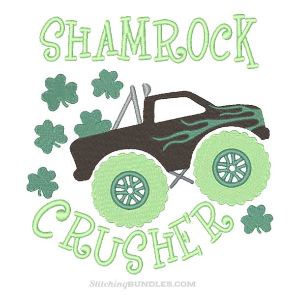 Shamrock Crusher Embroidery design. Perfect to put on shirts clothing for St Patrick’s Day or any day. moster truck